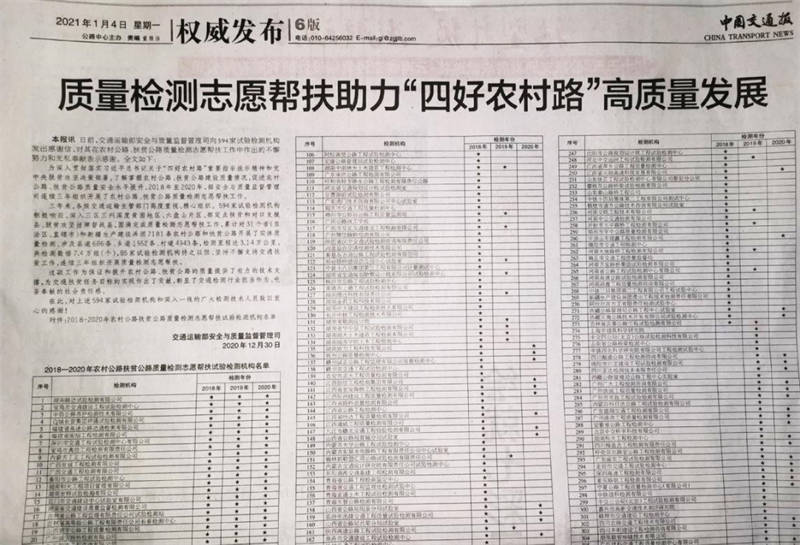 1月4日,中國交通報6版以《質(zhì)量檢測志愿幫扶助力“四好農(nóng)村路”高質(zhì)量發(fā)展》為題進行報道。