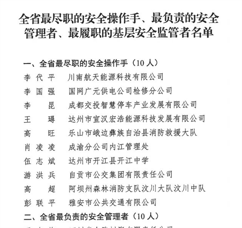此次評(píng)選活動(dòng),最終命名“全省最盡職的安全操作手、最負(fù)責(zé)的安全管理者、最履職的基層安全監(jiān)管者”各10名。彭聯(lián)平通過(guò)單位自薦、資格審查、初選入圍、網(wǎng)絡(luò)投票、專(zhuān)家評(píng)審、綜合評(píng)審和網(wǎng)上公示層層選拔,最終獲得“2021年全省最盡職的安全操作手”稱(chēng)號(hào),是雅安市唯一獲此殊榮的個(gè)人。