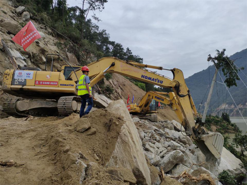 搶險(xiǎn)隊(duì)伍,馬上出發(fā)!集團(tuán)領(lǐng)導(dǎo)班子立即召開碰頭會,分析研判形勢,安排部署工作,密切關(guān)注震區(qū)態(tài)勢,成立抗震救災(zāi)領(lǐng)導(dǎo)小組,副總經(jīng)理鐘焱宇率現(xiàn)場指揮組趕赴石棉靠前指揮搶險(xiǎn)救災(zāi)。正在石棉G108線施工的康藏路橋公司項(xiàng)目部組成10人搶險(xiǎn)救援小分隊(duì),攜帶挖掘機(jī)4臺、拖車4臺、裝載機(jī)3臺、交通運(yùn)輸車2輛、無人機(jī)1臺,第一時(shí)間到就地?fù)岆U(xiǎn)工作,震后7小時(shí),完成國道G108線馬富至菩薩崗約40公里路段、6處塌方點(diǎn)1600余方土石方清理,爾后轉(zhuǎn)戰(zhàn)石棉縣新民鄉(xiāng)進(jìn)行通鄉(xiāng)道路搶通作業(yè)。