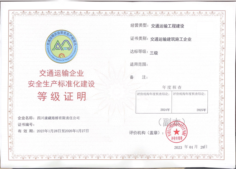 近日,經(jīng)四川省交通運(yùn)輸企業(yè)安全生產(chǎn)標(biāo)準(zhǔn)化評(píng)價(jià)機(jī)構(gòu)綜合評(píng)定,雅安交建集團(tuán)四川康藏路橋有限責(zé)任公司順利通過(guò)安全標(biāo)準(zhǔn)化三級(jí)評(píng)價(jià)驗(yàn)收并獲得“安全生產(chǎn)標(biāo)準(zhǔn)化三級(jí)企業(yè)”等級(jí)證明證書(shū)。