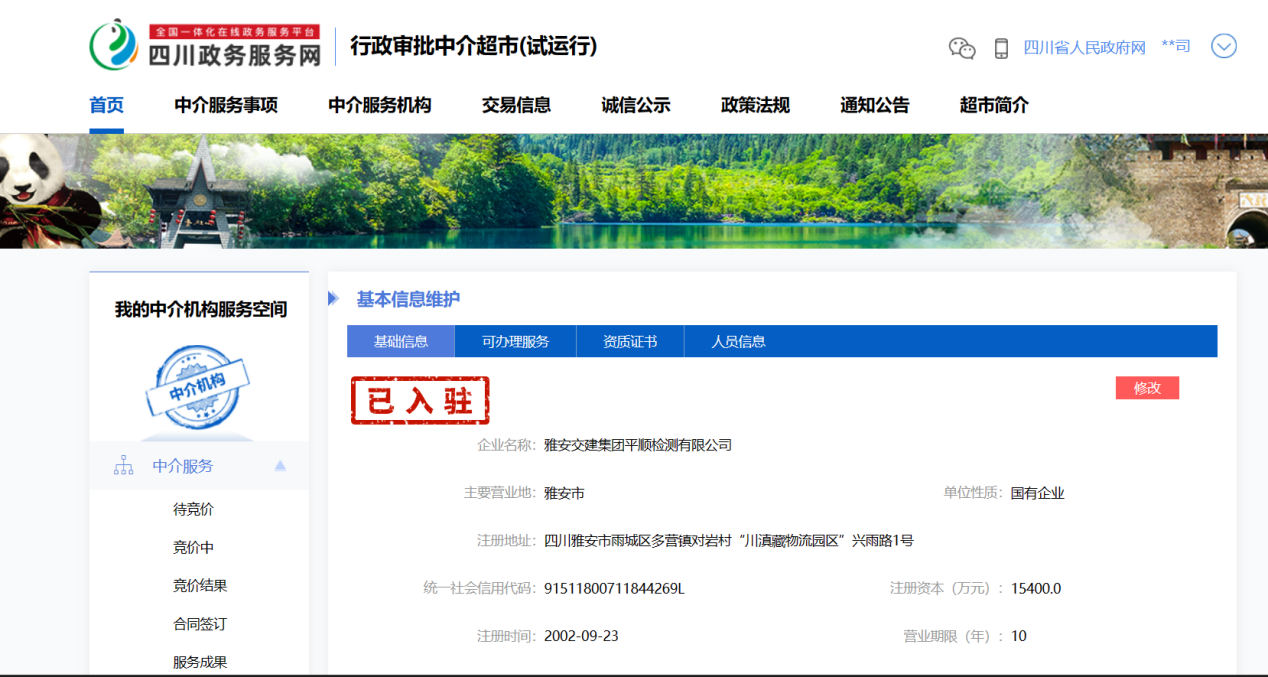 雅安交建集團平順檢測有限公司正式入駐四川政務服務網(wǎng)行政審批中介超市