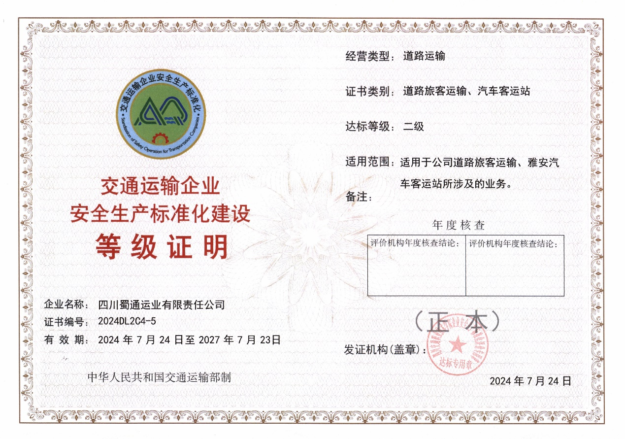 近日,經(jīng)四川省交通運輸企業(yè)安全生產(chǎn)標(biāo)準(zhǔn)化評價機構(gòu)綜合評定,雅安交建集團蜀通公司順利通過安全標(biāo)準(zhǔn)化二級企業(yè)驗收并獲得等級證書,標(biāo)志著公司安全管理工作更趨于標(biāo)準(zhǔn)化,安全管理水平邁上了新臺階。