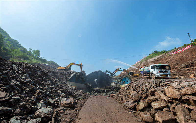 上午10點,金雞關(guān)隧道開挖現(xiàn)場,多臺大型破碎機和灑水除塵設(shè)備同時按下啟動鍵,建設(shè)的“沖鋒號”奏響。金雞關(guān)隧道開挖是整個項目取得突破性進(jìn)展的標(biāo)志,是路基鋪設(shè)和邊坡抗滑裝等施工開展的基礎(chǔ)。目前土方開挖已完成365萬方,邊坡施工已完成8級,項目整體推進(jìn)有序,預(yù)計兩個月完成隧道部分開挖。