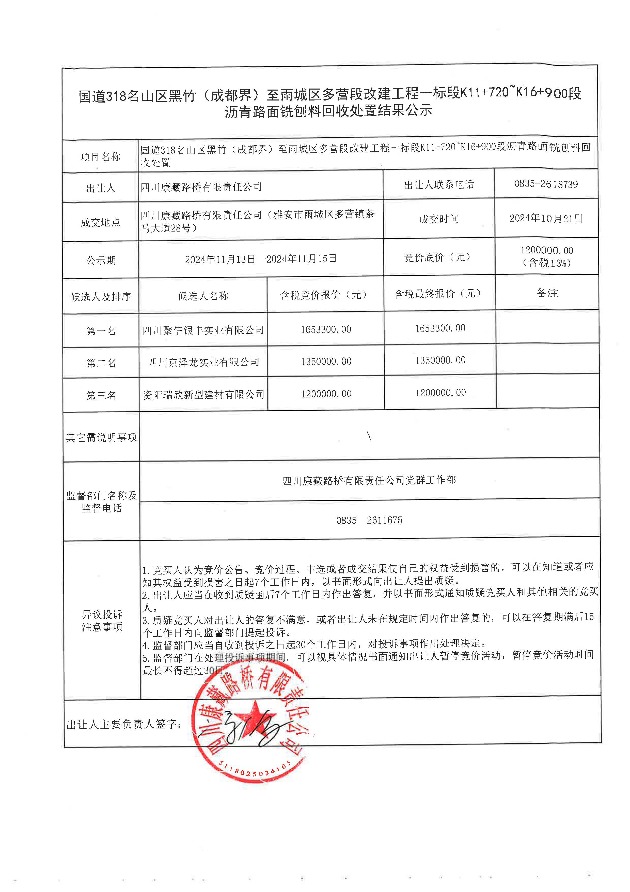 四川康藏路橋有限責任公司國道318名山區(qū)黑竹(成都界)至雨城區(qū)多營段改建工程一標段K11+720~K16+900段瀝青路面銑刨料回收處置結(jié)果公示