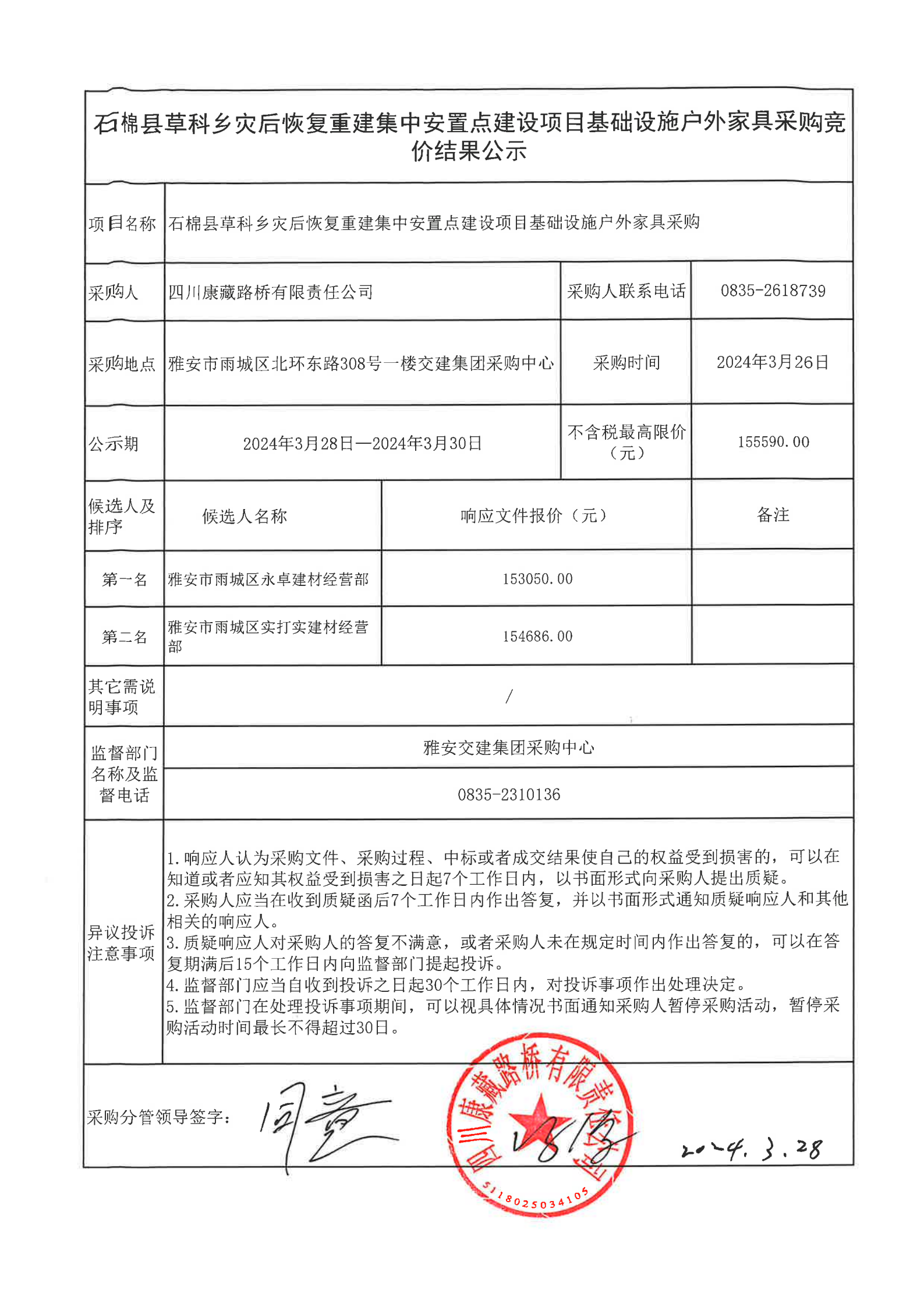 四川康藏路橋有限責(zé)任公司石棉縣草科鄉(xiāng)災(zāi)后恢復(fù)重建集中安置點(diǎn)建設(shè)項(xiàng)目基礎(chǔ)設(shè)施戶外家具采購競價結(jié)果公示