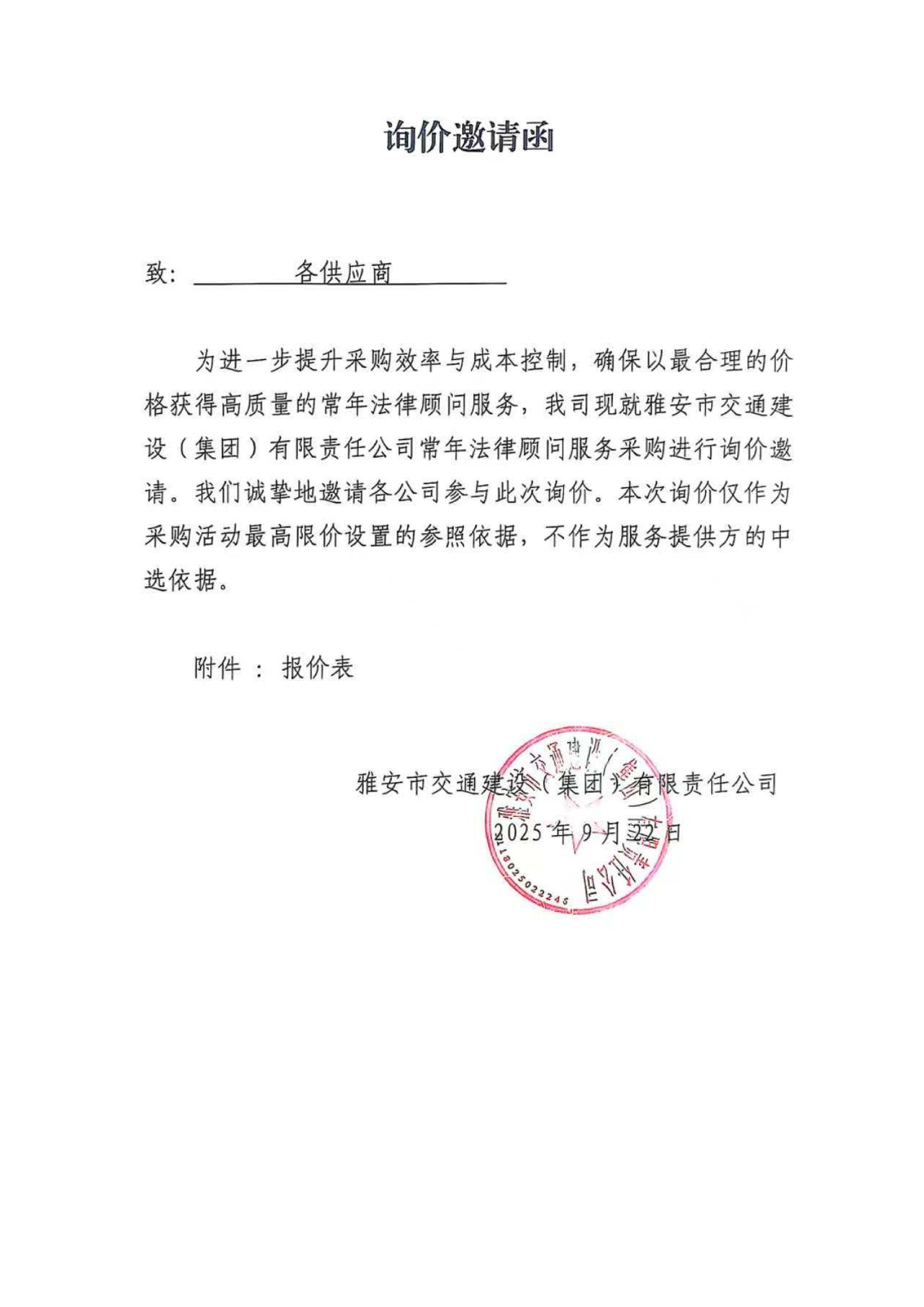 關(guān)于雅安市交通建設(shè)(集團(tuán))有限責(zé)任公司常年法律顧問(wèn)服務(wù)的詢價(jià)函