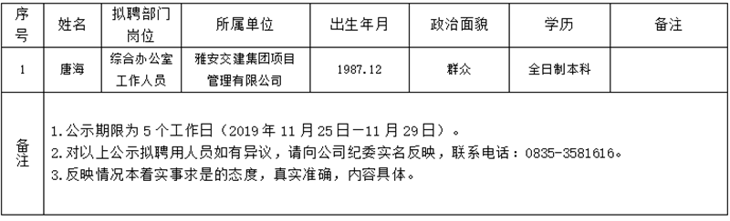 雅安交建集團子公司擬聘用人員公示(大興公司)