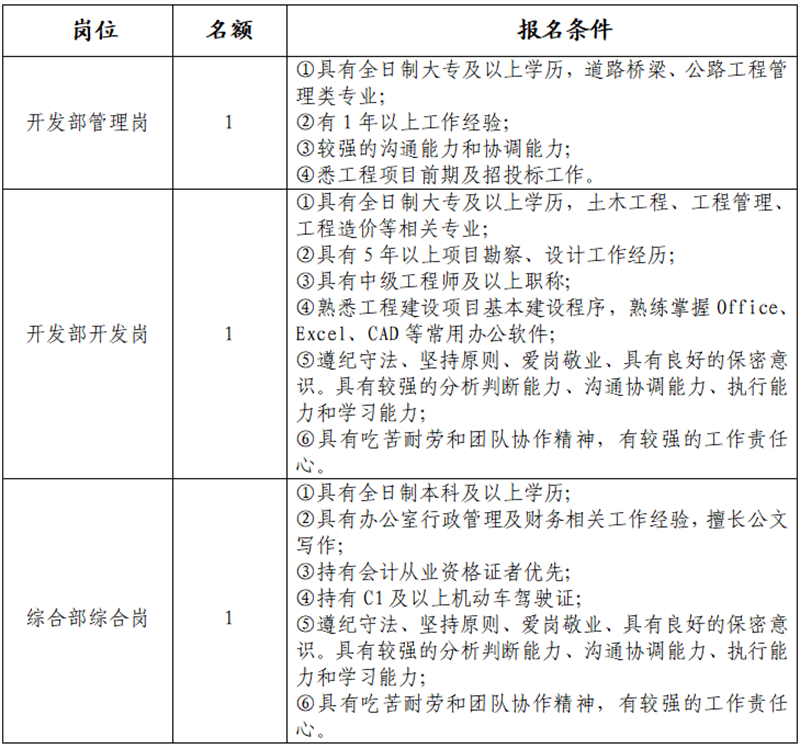 雅安交建集團(tuán)大興交通開(kāi)發(fā)有限公司是雅安市重點(diǎn)國(guó)有企業(yè)雅安市交建集團(tuán)下屬子公司,主要從事交通基礎(chǔ)設(shè)施及服務(wù)設(shè)施投資、建設(shè)開(kāi)發(fā);土地整理;房地產(chǎn)開(kāi)發(fā);建筑材料生產(chǎn)、銷(xiāo)售;旅游開(kāi)發(fā)等業(yè)務(wù)。根據(jù)公司發(fā)展需要,決定面向社會(huì)公開(kāi)招聘3名工作人員,現(xiàn)將有關(guān)事項(xiàng)公告如下: