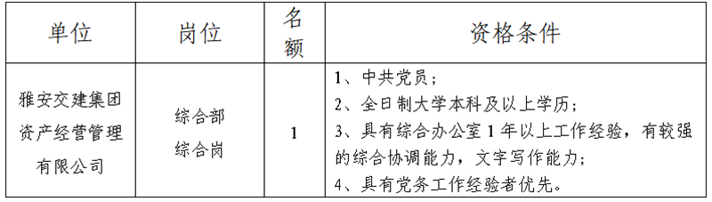 根據(jù)發(fā)展需要,決定面向社會(huì)公開(kāi)招聘雅安市交通建設(shè)(集團(tuán))有限責(zé)任公司(以下簡(jiǎn)稱(chēng)“雅安交建集團(tuán)”)所屬子一般工作人員1名,現(xiàn)將有關(guān)事項(xiàng)公告如下: