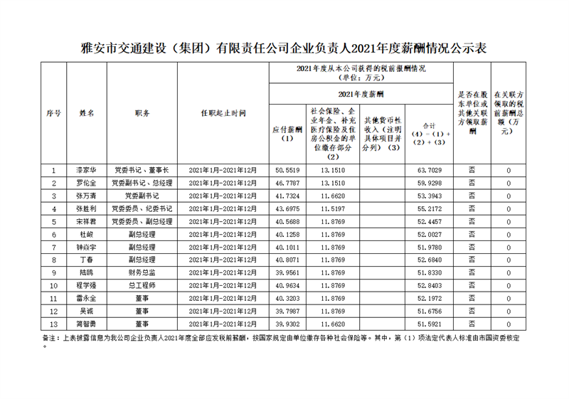 :雅安市交通建設(shè)(集團(tuán))有限責(zé)任公司企業(yè)負(fù)責(zé)人2021年度薪酬情況公示表
