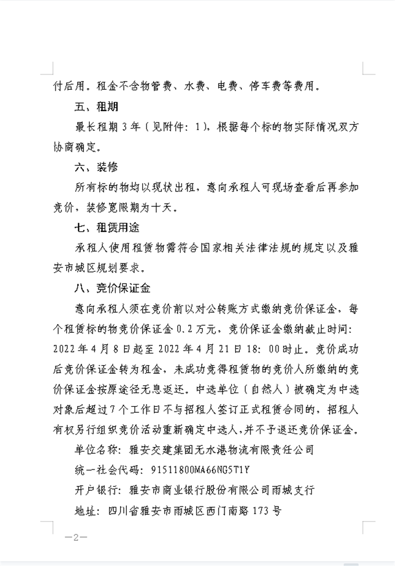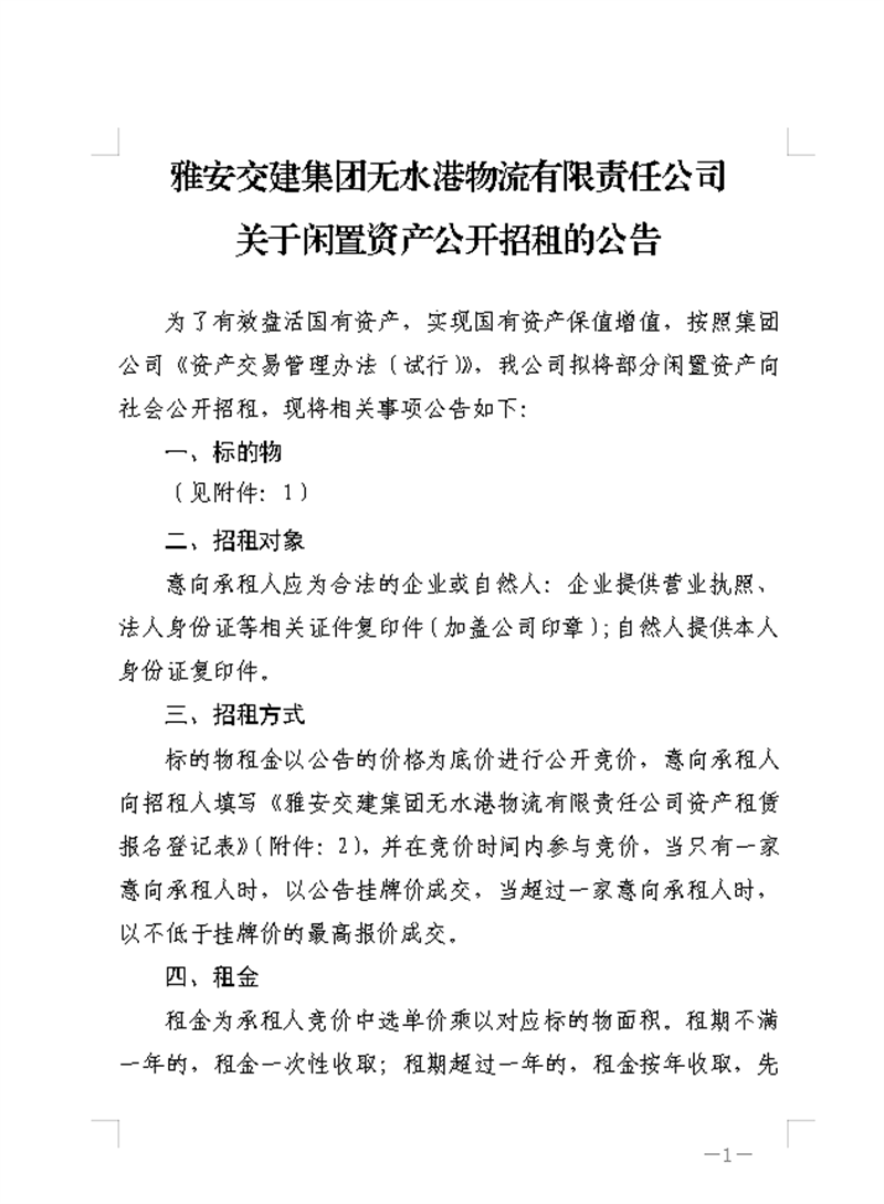 雅安交建集團(tuán)無(wú)水港物流有限責(zé)任公司關(guān)于資產(chǎn)掛網(wǎng)招租的公告