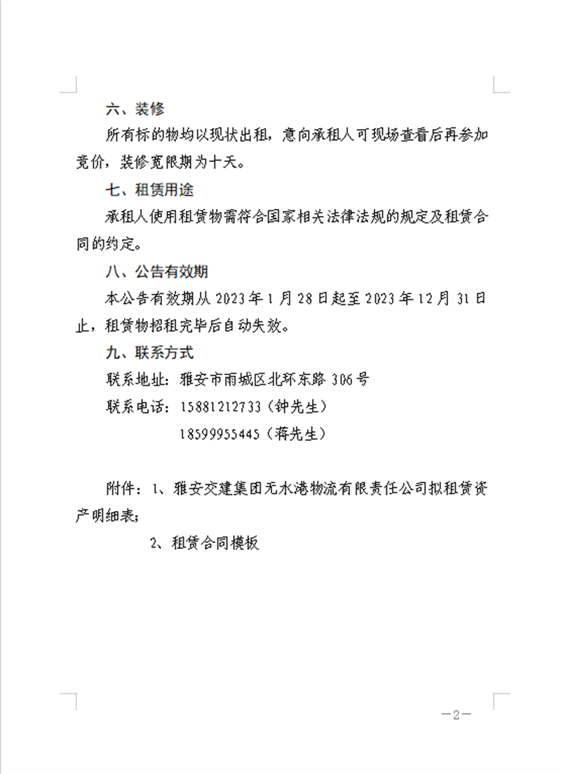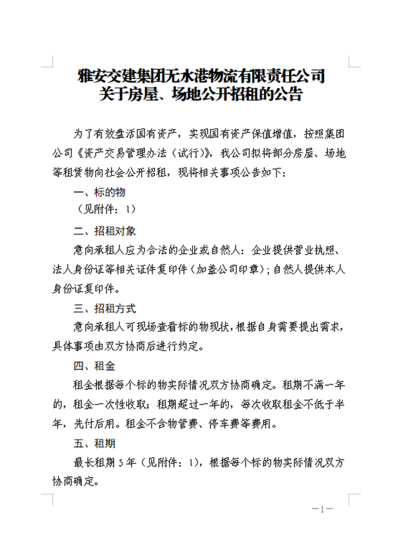 雅安交建集團(tuán)無(wú)水港物流有限責(zé)任公關(guān)于房屋、場(chǎng)地公開招租的公告