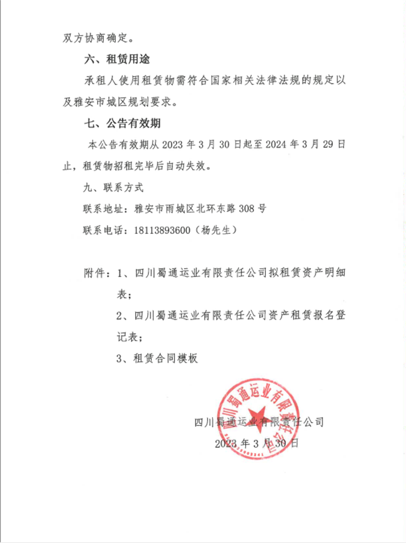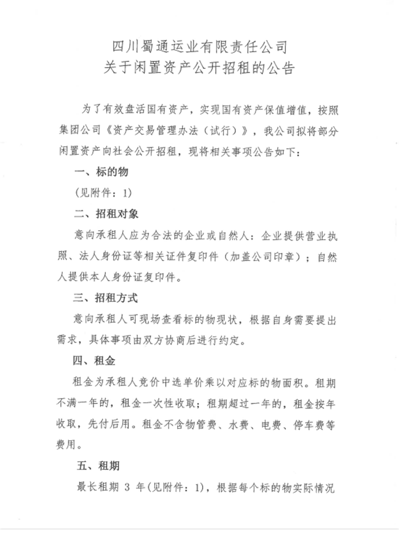 蜀通運業(yè)有限責任公司關于閑置資產(chǎn)公開招租的公告附件