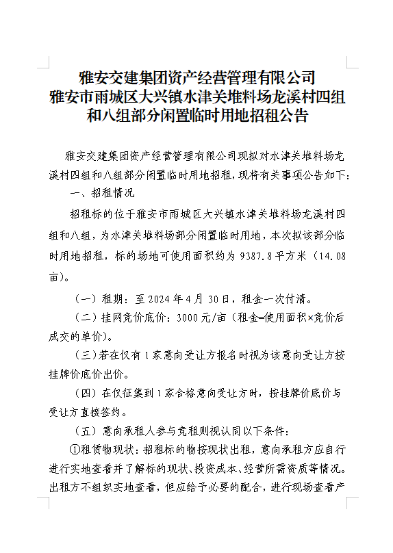 雅安交建集團(tuán)資產(chǎn)經(jīng)營(yíng)管理有限公司 雅安市雨城區(qū)大興鎮(zhèn)水津關(guān)堆料場(chǎng)龍溪村四組和八組部分閑置臨時(shí)用地招租公告附件