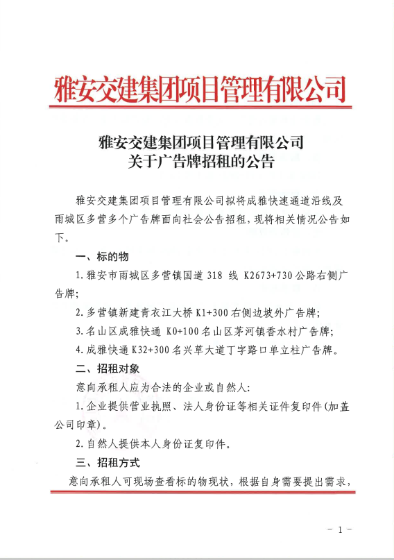 雅安交建集團(tuán)項目管理有限公司關(guān)于廣告牌招租的公告
