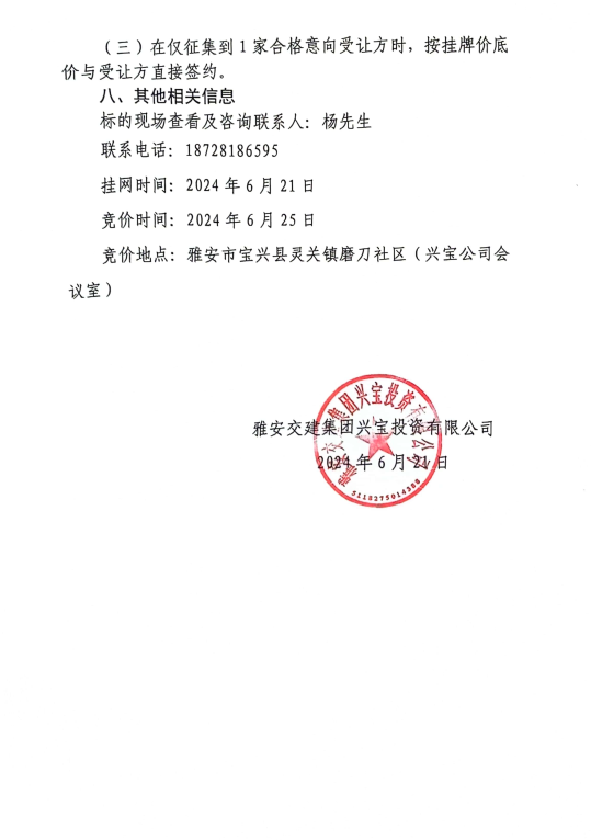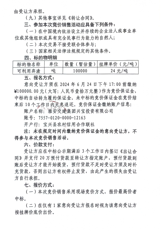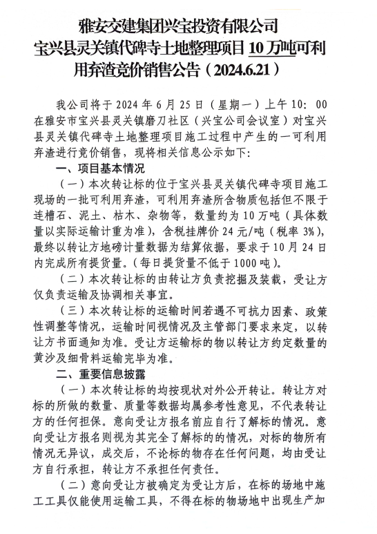 雅安交建集團(tuán)興寶投資有限公司寶興縣靈關(guān)鎮(zhèn)代碑寺土地整理項(xiàng)目10萬噸可利用棄渣競價銷售公告(2024.6.21)