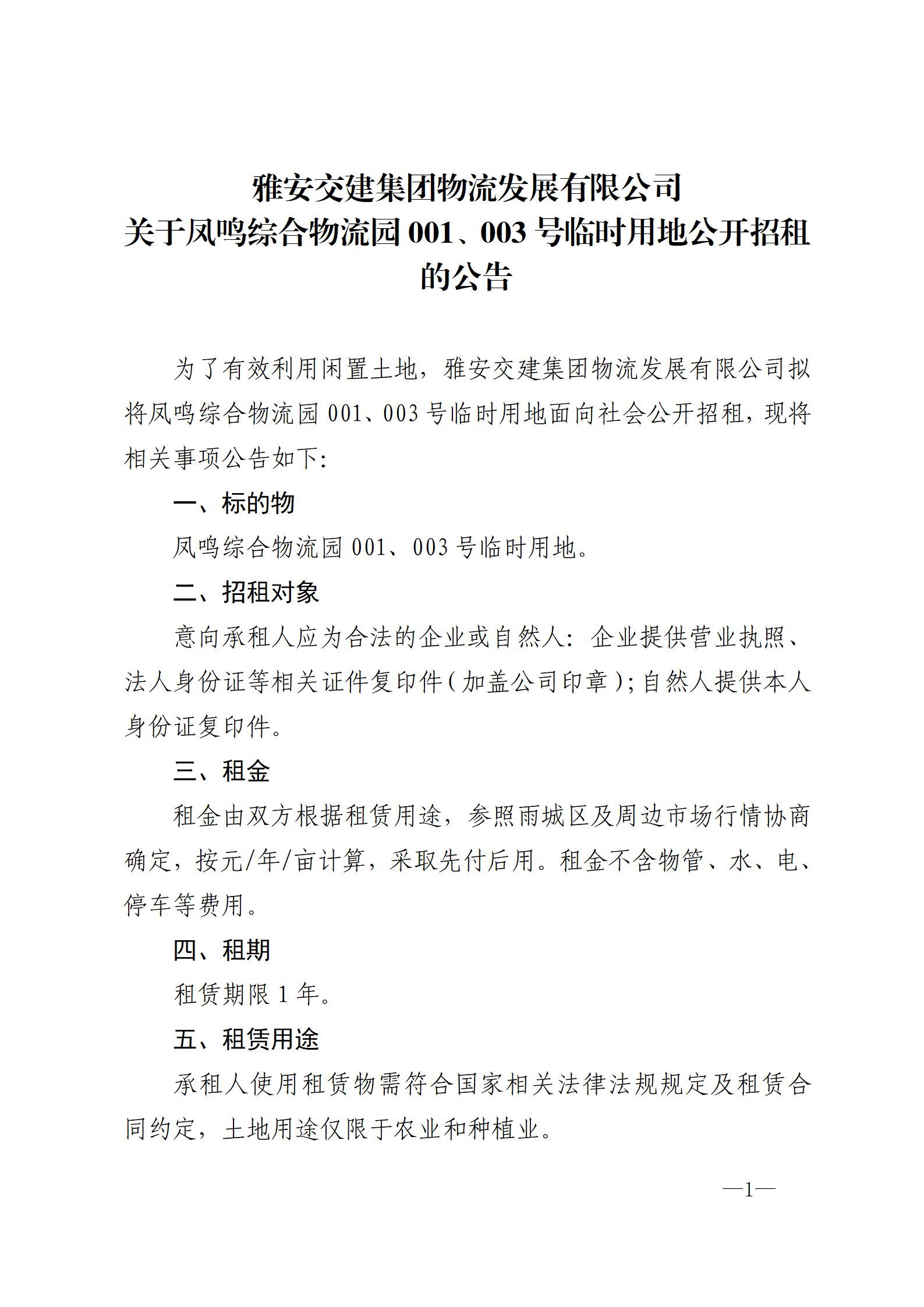 雅安交建集團(tuán)物流發(fā)展有限公司 關(guān)于鳳鳴綜合物流園001、003號(hào)臨時(shí)用地公開(kāi)招租的公告