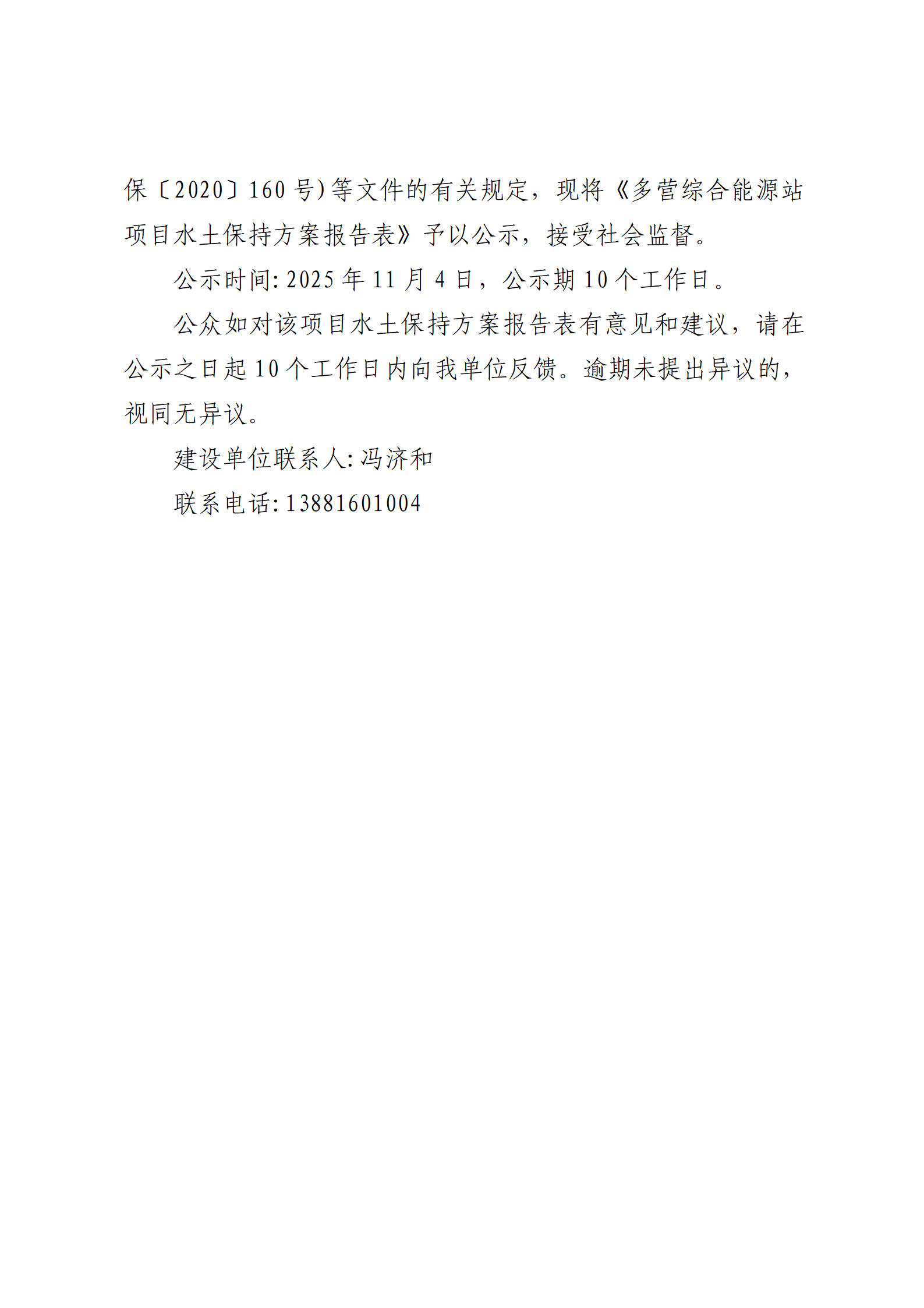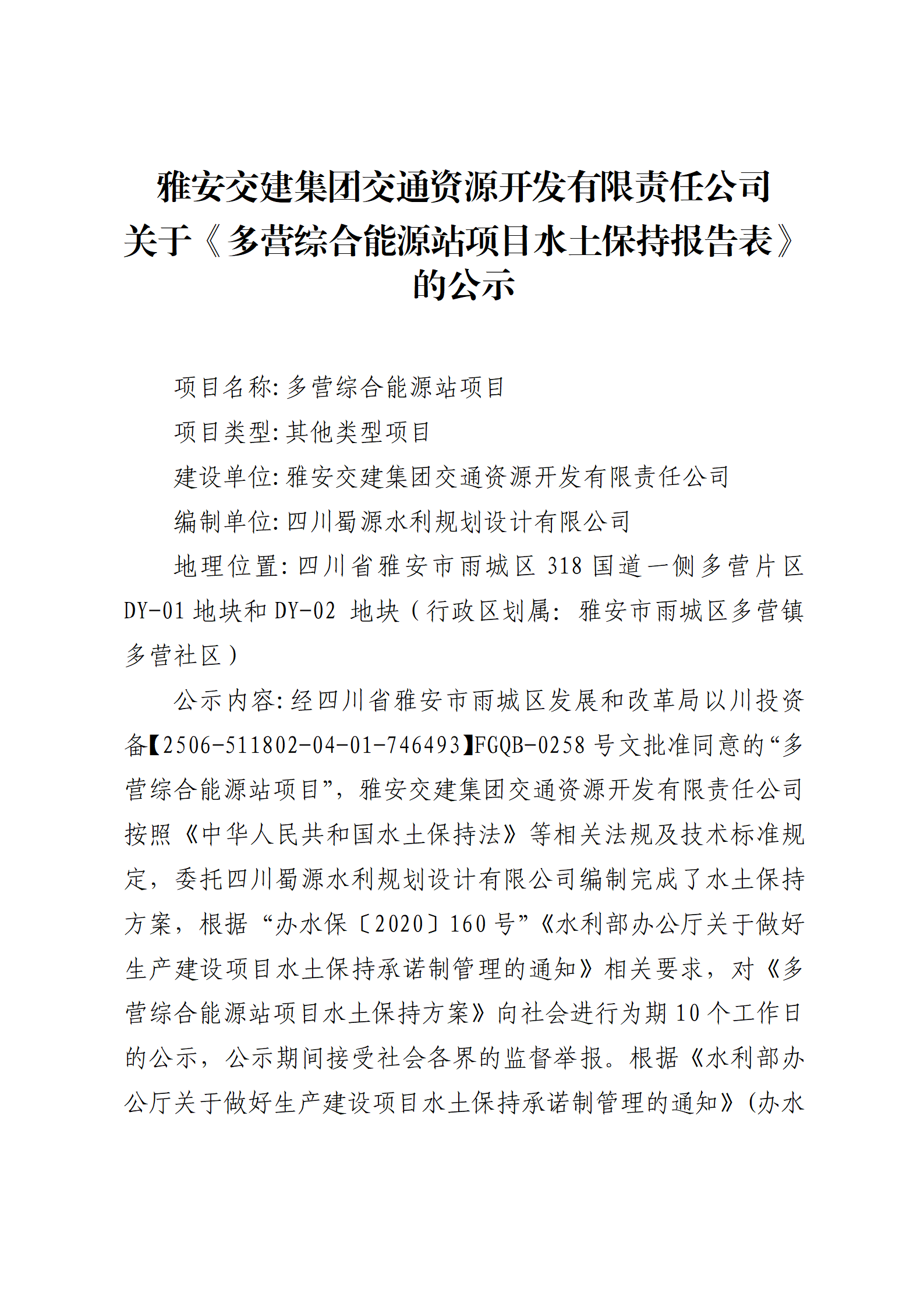 雅安交建集團(tuán)交通資源開(kāi)發(fā)有限責(zé)任公司 關(guān)于《多營(yíng)綜合能源站項(xiàng)目水土保持報(bào)告表》的公示
