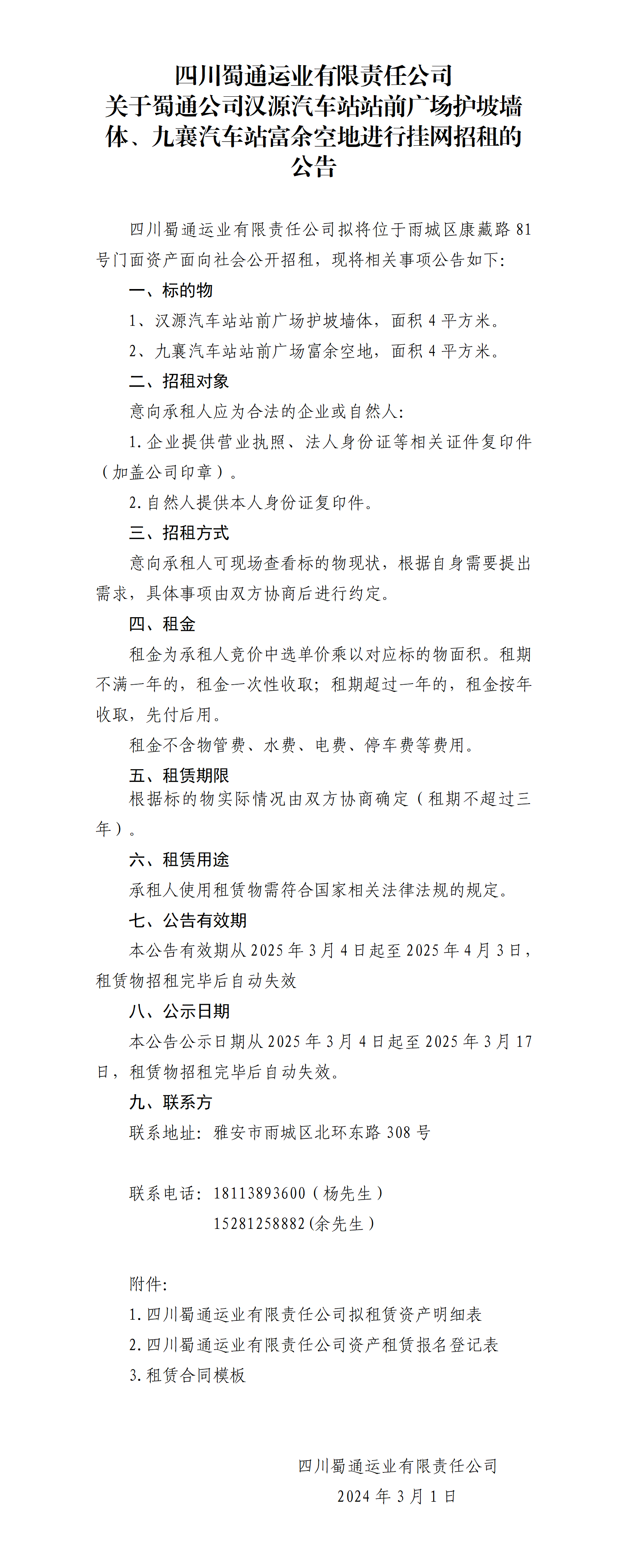 四川蜀通運業(yè)有限責任公司 關(guān)于蜀通公司漢源汽車站站前廣場護坡墻體、九襄汽車站富余空地進行掛網(wǎng)招租的公告