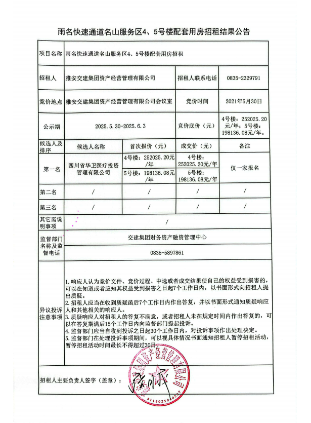 雨名快速通道名山服務區(qū)4、5號樓配套用房招租結果公告