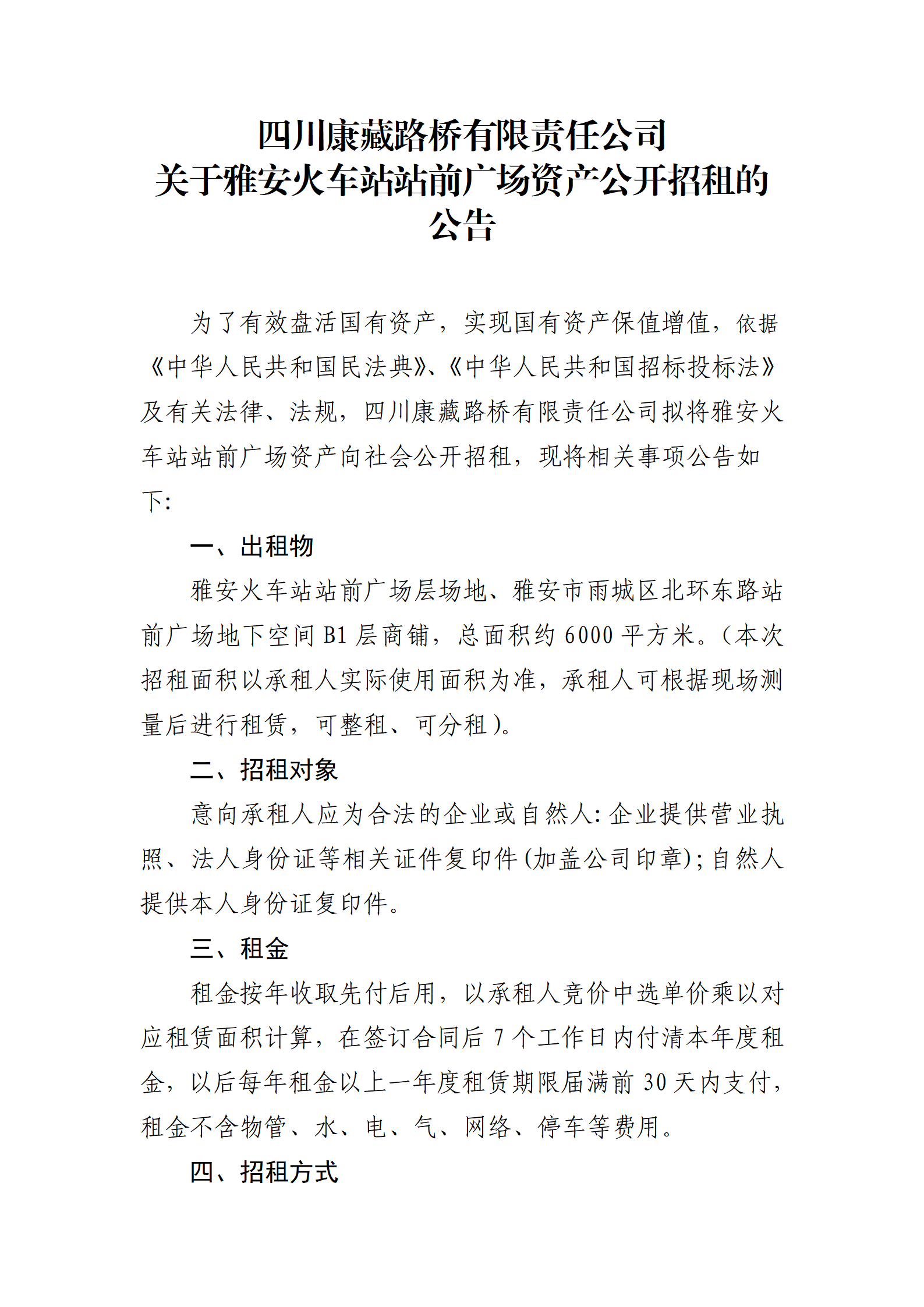 四川康藏路橋有限責(zé)任公司站前廣場(chǎng)資產(chǎn)招租公告