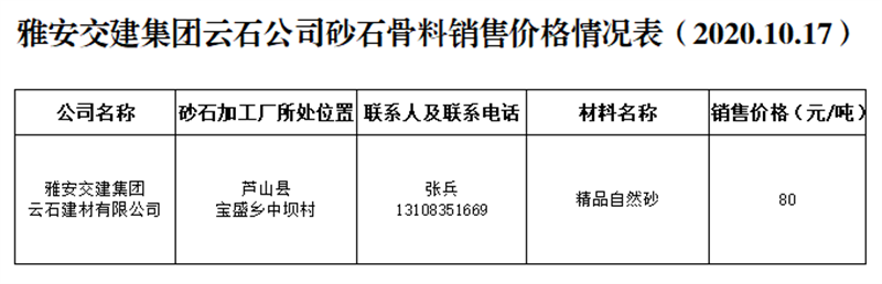 雅安交建集團(tuán)興寶公司砂石骨料銷售價(jià)格情況表(2020.10.16)
