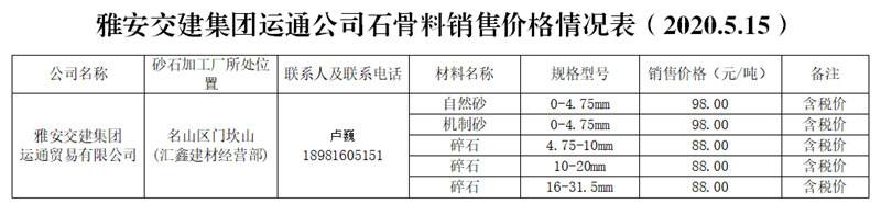 運通貿(mào)易有限公司。運通公司是雅安市交通建設(集團)有限責任公司獨資子公司,主要負責雨城區(qū)中心城區(qū)河道外砂石經(jīng)營管理工作。目前,公司與名山區(qū)匯鑫建材經(jīng)營部確定了代加工合作關(guān)系,已投產(chǎn),預計年生產(chǎn)能力約30萬噸。