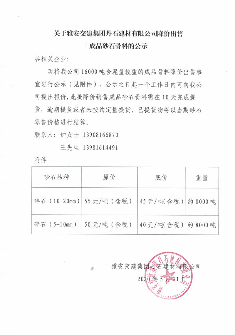 關于雅安交建集團丹石建材有限公司降價出售 成品砂石骨料的公示