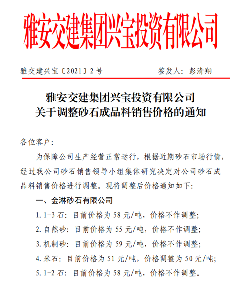 雅安交建集團興寶公司砂石骨料銷售價格情況表(2021.1.14)