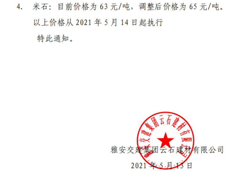 雅安交建集團云石公司砂石骨料銷售價格情況表(2021.5.3)