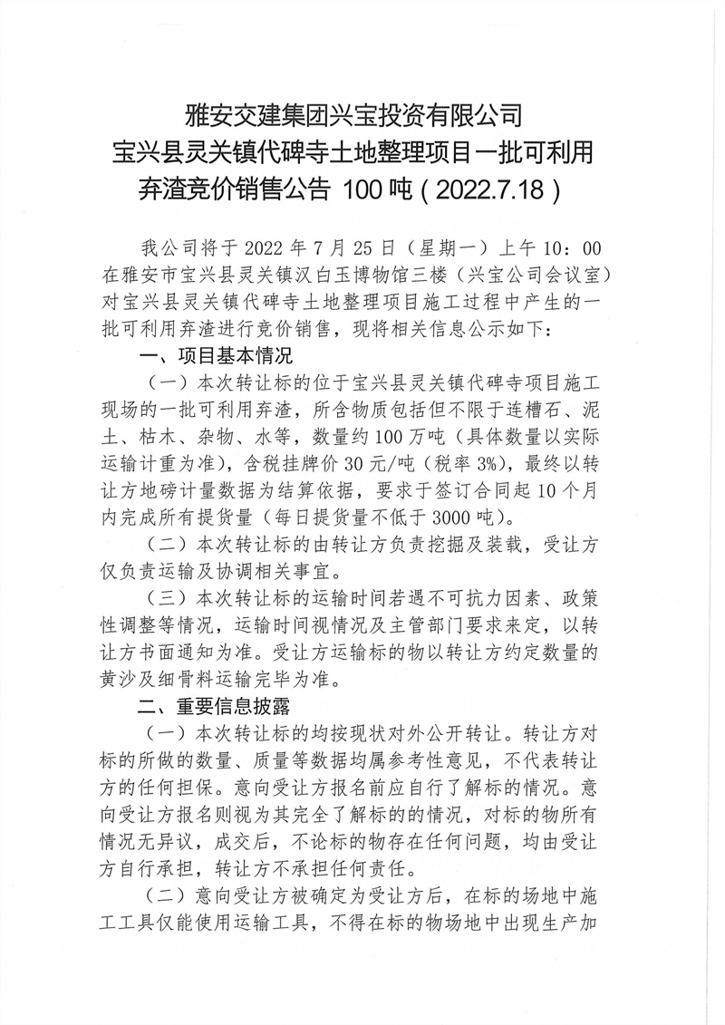 興寶公司寶興縣靈關(guān)鎮(zhèn)代碑寺土地整理項(xiàng)目10萬(wàn)噸可利用棄渣競(jìng)價(jià)銷售掛網(wǎng)公告掛網(wǎng)公告7.22(5萬(wàn)噸)