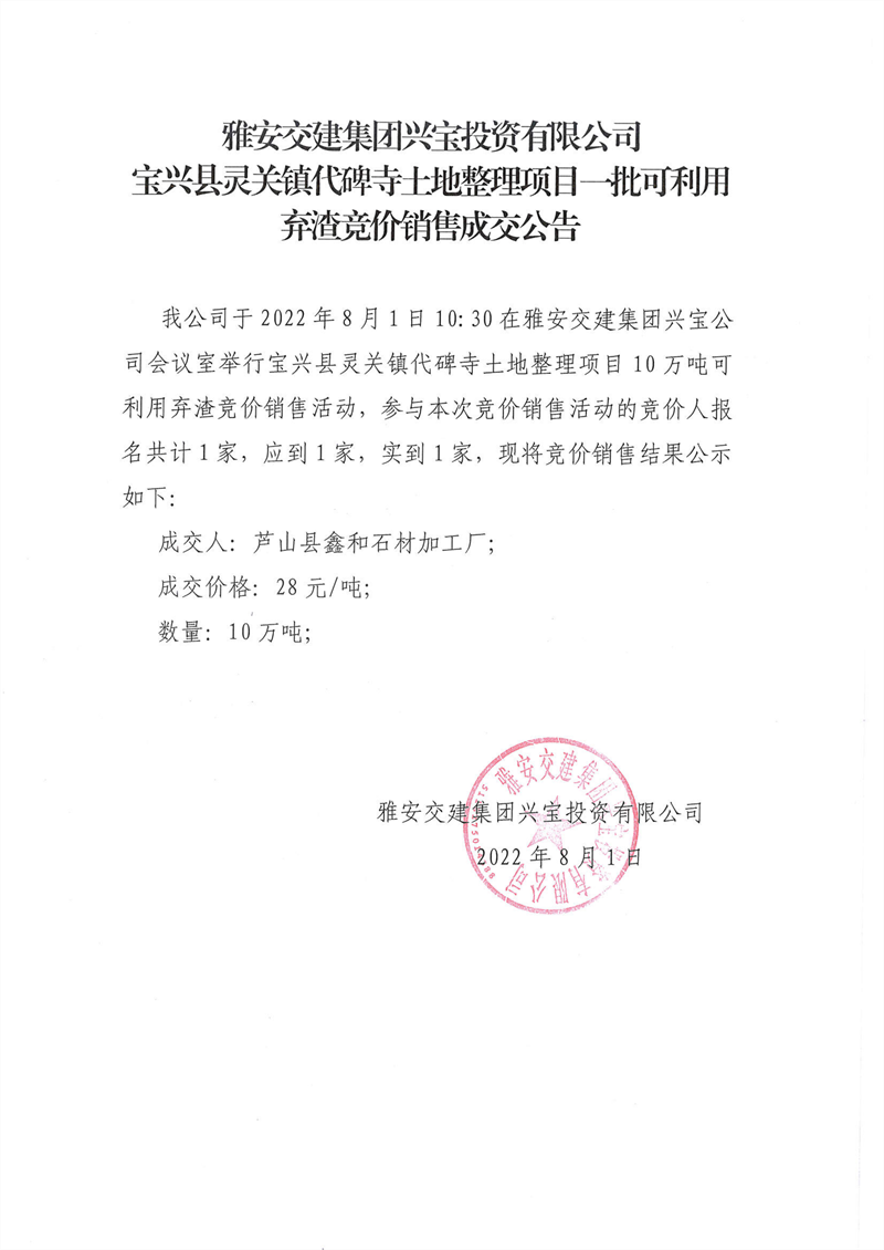 雅安交建集團(tuán)興寶投資有限公司靈關(guān)鎮(zhèn)代碑寺土地整理項(xiàng)目5萬噸可利用棄渣競(jìng)價(jià)銷售成交公告(2022.8.1)