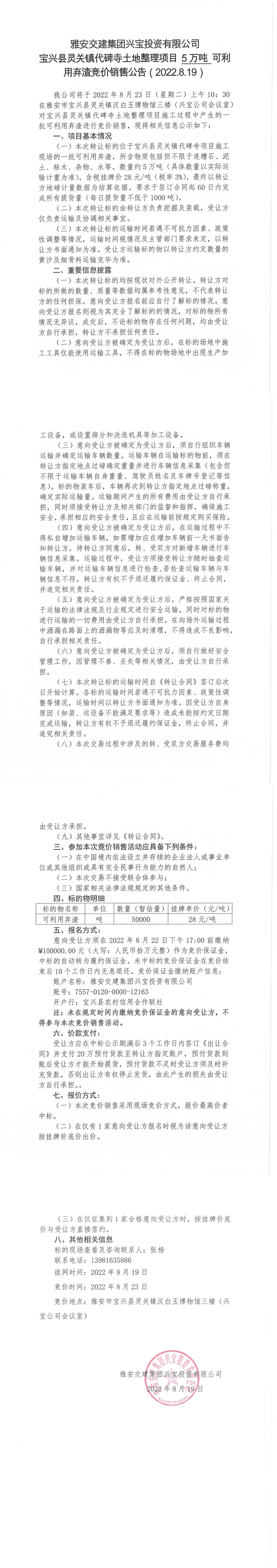 雅安交建集團(tuán)興寶投資有限公司靈關(guān)鎮(zhèn)代碑寺土地整理項(xiàng)目10萬(wàn)噸可利用棄渣競(jìng)價(jià)銷售公告(2022.8.19)(1)