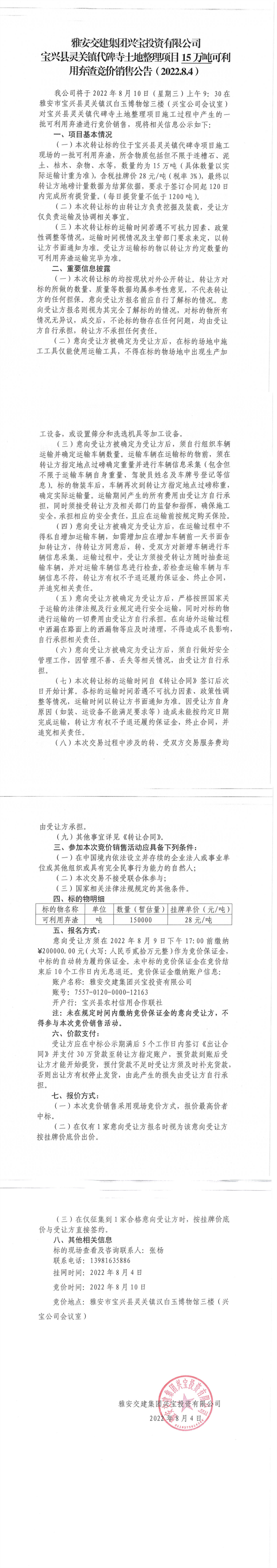 雅安交建集團(tuán)興寶投資有限公司靈關(guān)鎮(zhèn)代碑寺土地整理項(xiàng)目15萬噸可利用棄渣競(jìng)價(jià)銷售公告(2022.8.4)