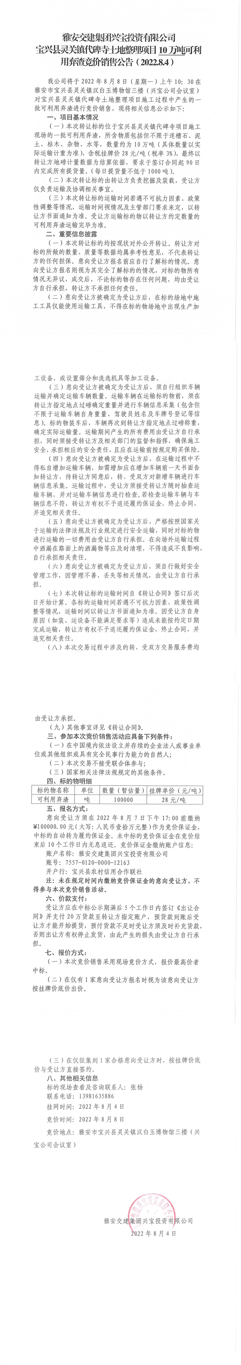 雅安交建集團興寶投資有限公司靈關鎮(zhèn)代碑寺土地整理項目5萬噸可利用棄渣競價銷售公告(2022.8.4)
