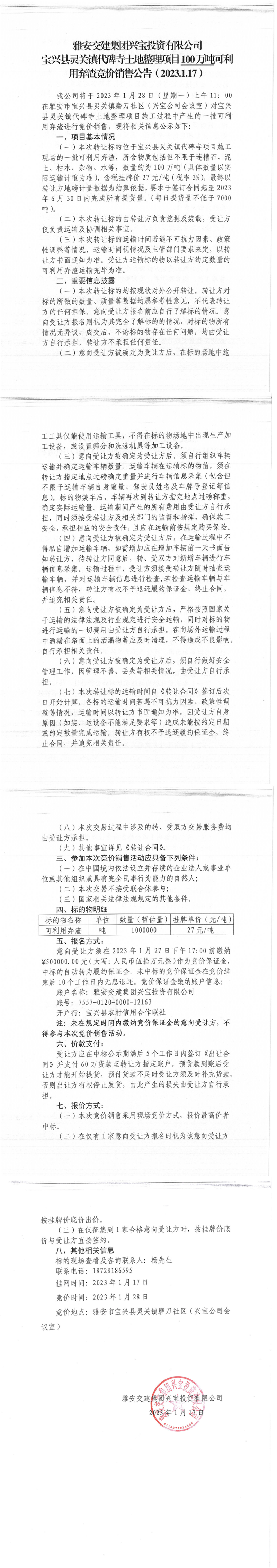 雅安交建集團(tuán)興寶投資有限公司100萬噸可利用棄渣競(jìng)價(jià)銷售流標(biāo)公告(2023.1.16)