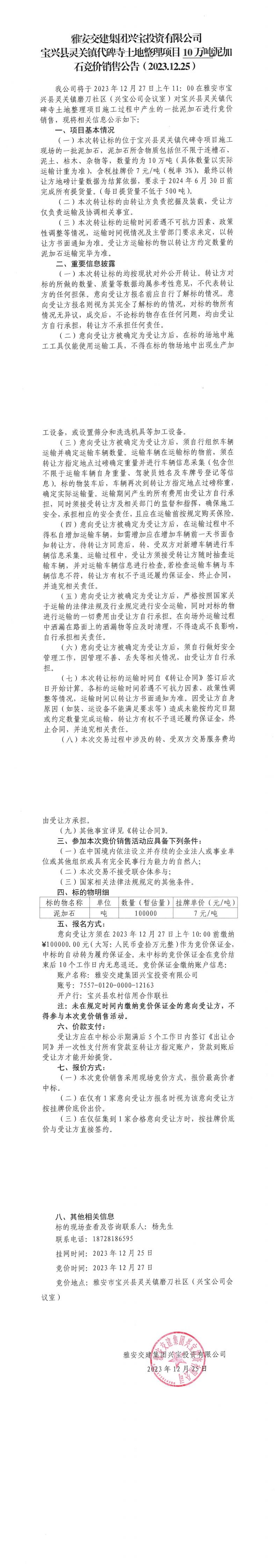 雅安交建集團(tuán)興寶投資有限公司10萬(wàn)噸泥加石競(jìng)價(jià)銷(xiāo)售公告(2023.12.25)