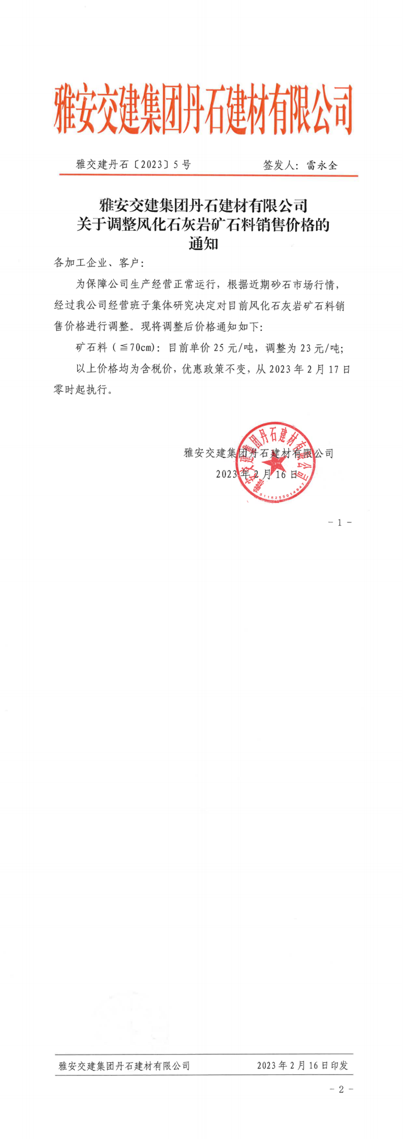 雅交建丹石(2023)5號(hào)調(diào)整風(fēng)化石灰?guī)r礦料銷(xiāo)售價(jià)格的通知(2023.02.16)