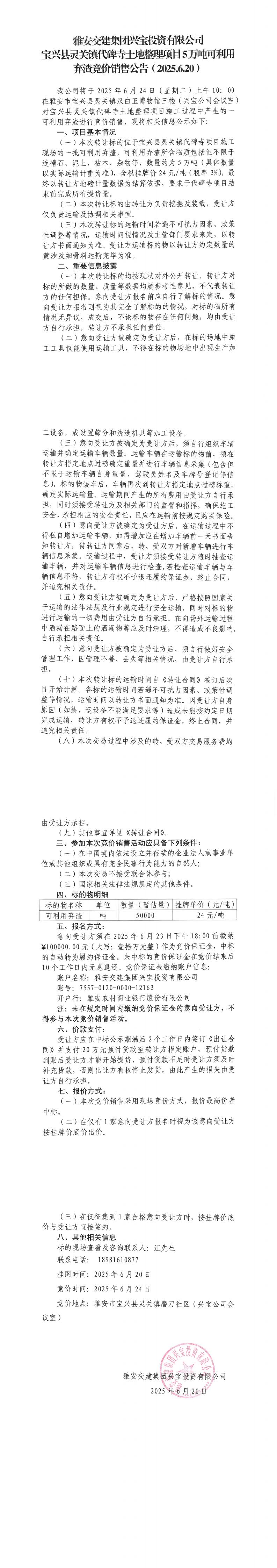 雅安交建集團(tuán)興寶投資有限公司寶興縣靈關(guān)鎮(zhèn)代碑寺土地整理項(xiàng)目10萬(wàn)噸可利用棄渣競(jìng)價(jià)銷售公告